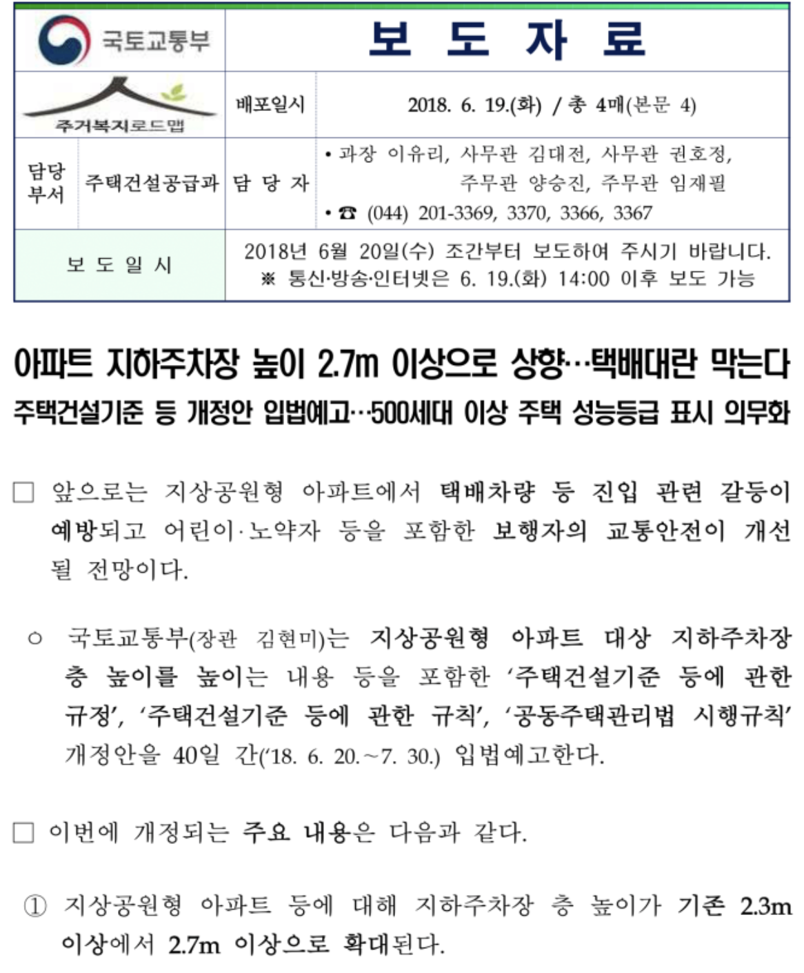 이슈였던 다산 신도시 택배 대란 이후로 아파트 지하주차장의 높이를 2.7m 상향하는 법이 2018년 8월 시행되었습니다.