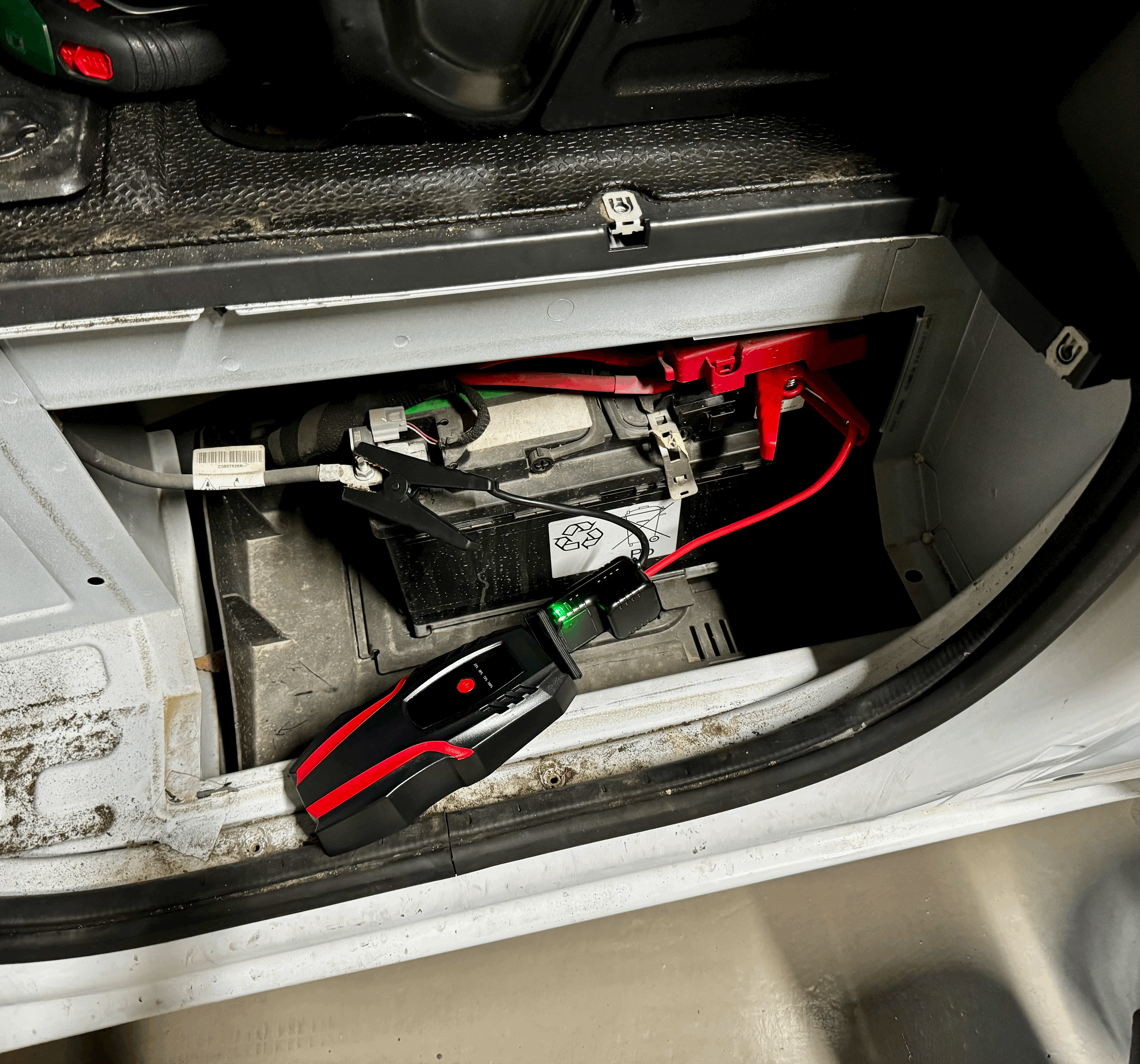 휴대용 점프 배터리를 연결하고, 시동을 걸었다.
