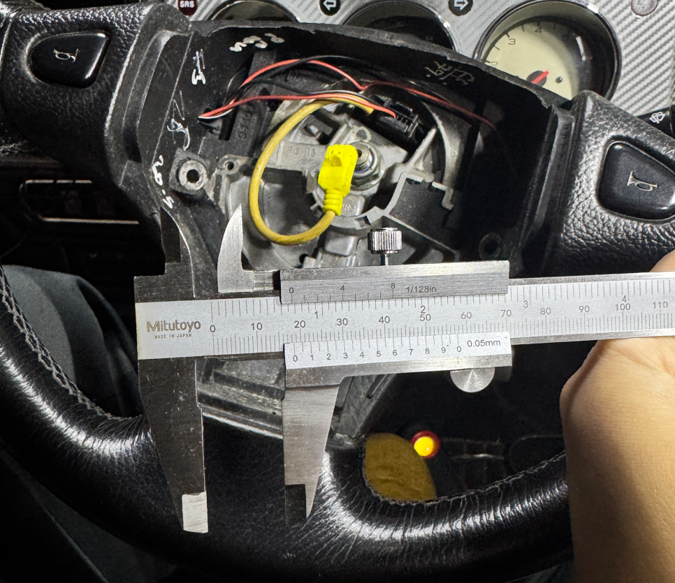 에어백을 분리하고, 스티어링휠 너트의 크기를 측정해 보니 18.5mm 정도입니다.