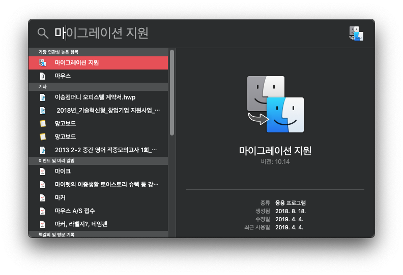 일단 '커멘드+스페이스' 를 눌러서 spotlight에서 마이그레이션 지원을 찾아 실행한다.