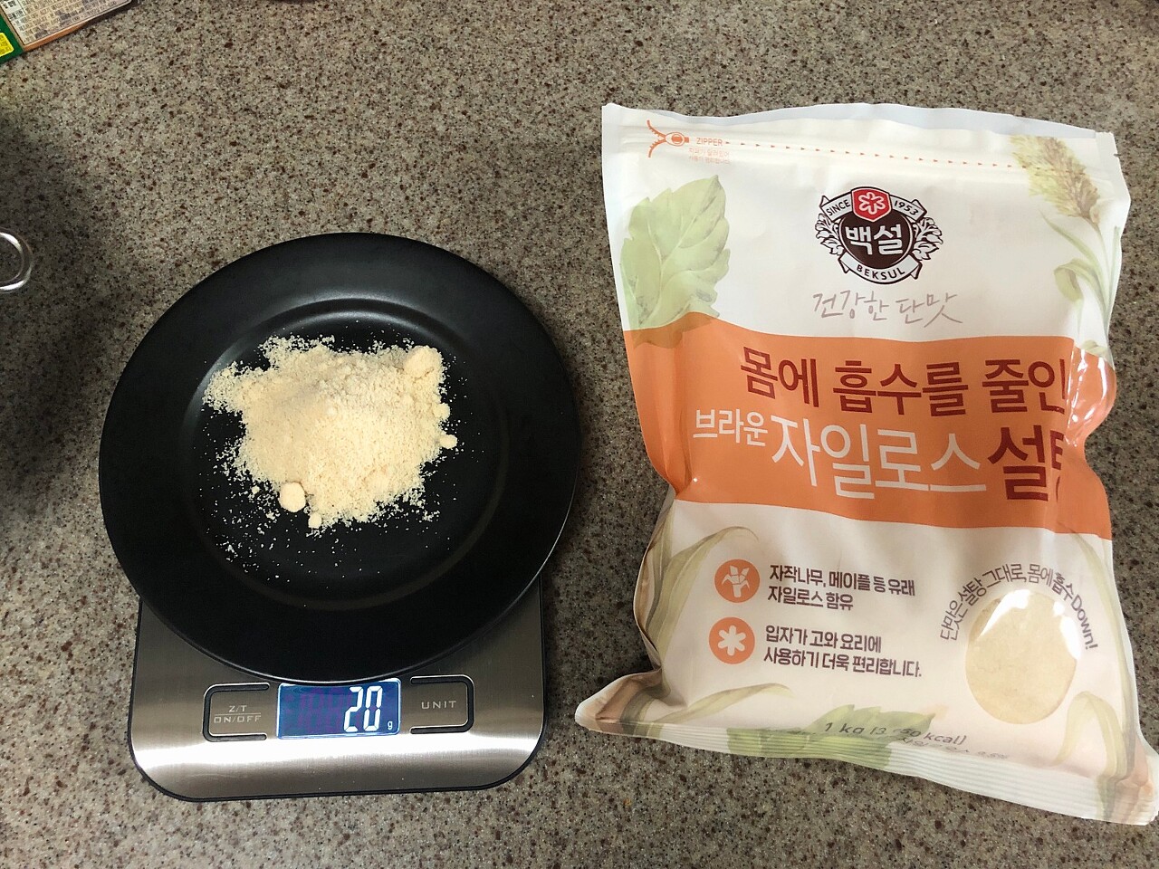설탕 20g, 소금 한꼬집, 베이킹파우더 3g을 함께 '남자답게' 때려넣어요.