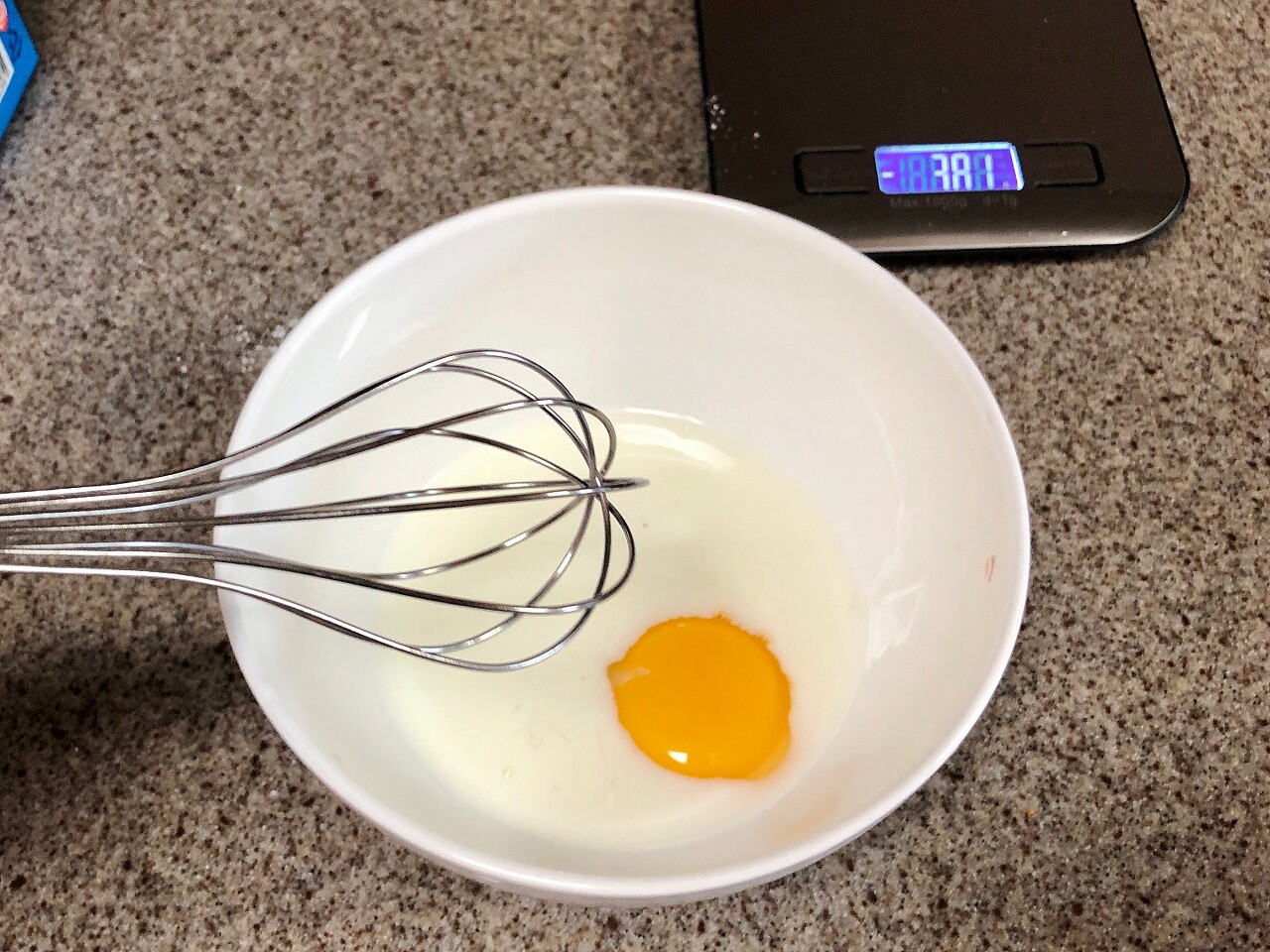 우유 60g에 계란 한개를 '남자답게' 사정없이 휘저어 주세요.
