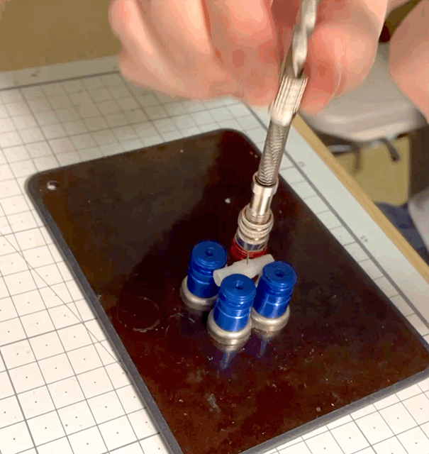두개의 원통 중에 하나에 핀바이스를 사용해서 구멍을 뚫어줍니다.