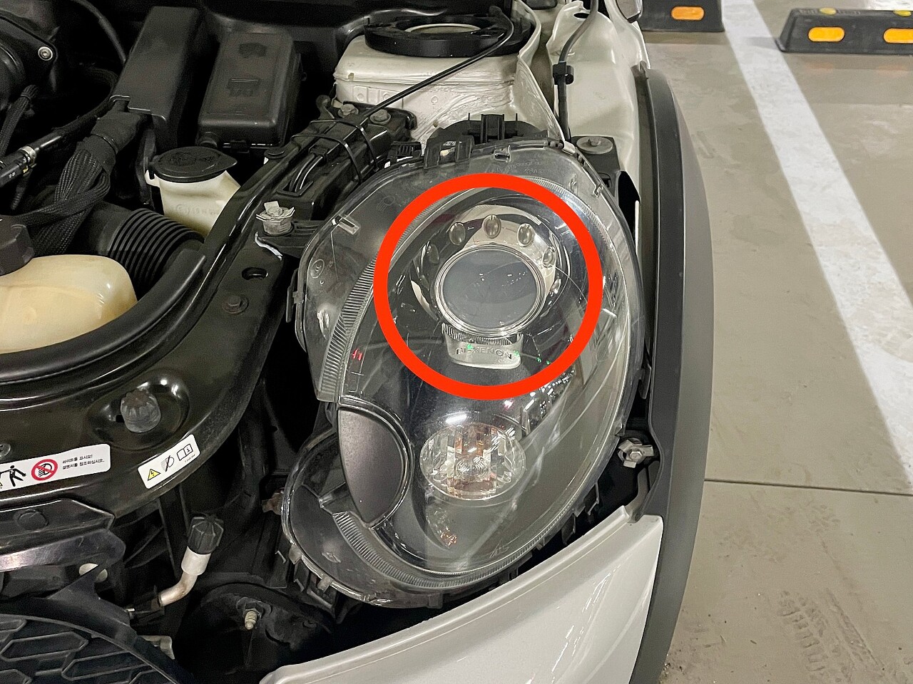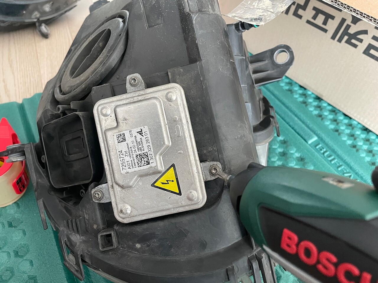본격적으로 작업을 시작하기 전에 발라스터(안정기)와 워셔액 모터를 분리해줍니다.