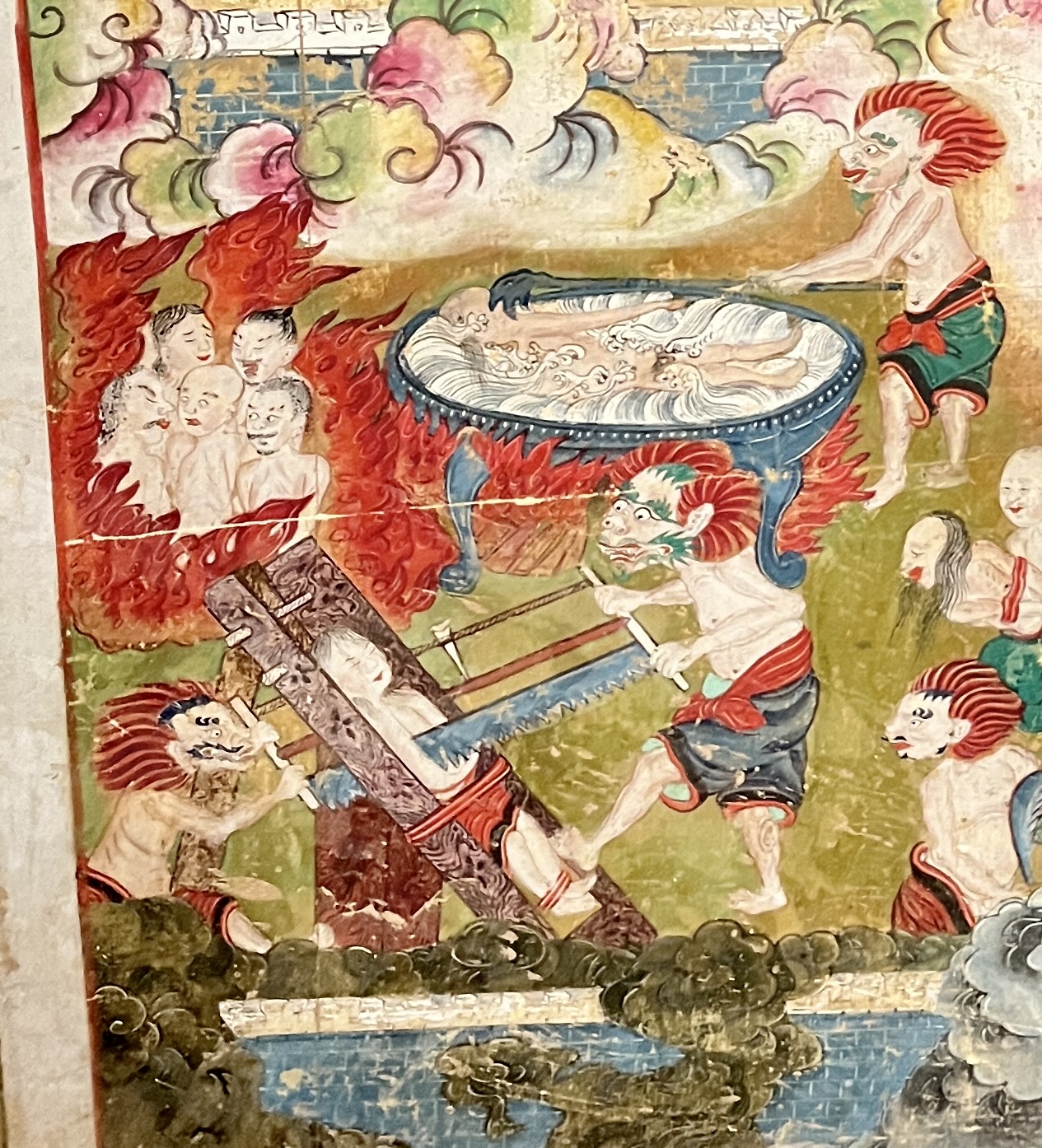 그에 따라 톱으로 썰고, 끓는 기름에 넣고, 영혼에 쇠말뚝을 박고, 불에 태우고..(세번째 사진)