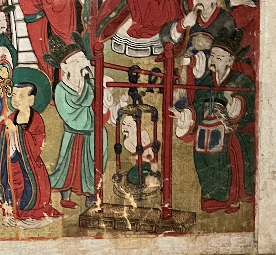 그에 따라 톱으로 썰고, 끓는 기름에 넣고, 영혼에 쇠말뚝을 박고, 불에 태우고..(세번째 사진)